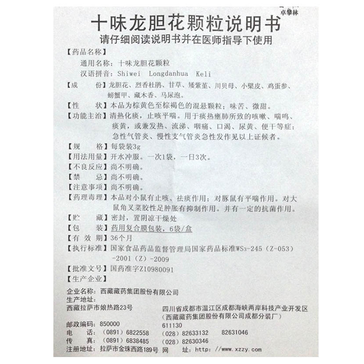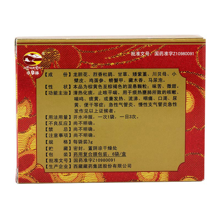 【主要成份】龍膽花、烈香杜鵑、甘草、矮紫菫、川貝母、小檗皮、雞蛋參、螃蟹甲、藏木香、馬尿泡。