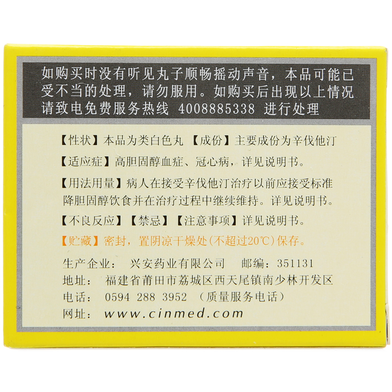 【注意事項】1、肌肉作用: HMG-CoA還原酶抑制劑偶爾會引起肌病,表現為肌肉疼痛或無力并伴有CK顯著升高(高于正常值上限的10倍)。伴有或不伴有繼發性肌紅蛋白尿癥的急性腎功能衰竭的橫紋肌溶解罕見報道。北歐辛伐他汀生存研究中,在中位數5.4年期間,1399名每天服用辛伐他汀20mg的患者中出現1例肌病,而822名每天服用辛伐他汀40mg的患者中沒有出現肌病。在兩項為期6個月的臨床對照研究中,436名服用辛伐他汀40mg的患者中出現1例肌病,而699名服用辛伐他汀80mg的患者中出現5例肌病。辛伐他汀與某些藥物合并治療會增加肌病的危險,上述研究設計排除了其中的部分藥物。藥物相互作用引起的肌病: HMG-CoA還原酶抑制劑與單獨用藥即可引起肌病的藥物合并使用,會增加肌病的發生率和嚴重程度,這些藥物包括吉非貝齊和其它貝特類,以及降脂劑量(≥1g/天)的煙酸(尼克酸)。胺碘酮或維拉帕米與辛伐他汀合用會增加辛伐他汀引起橫紋肌溶解的風險,且這種風險的發生幾率與辛伐他汀的劑量相關。正在接受胺碘酮治療的患者辛伐他汀的日劑量不能超過20mg,或考慮使用其他他汀類藥物代替辛伐他汀。此外,血漿中HMG-CoA還原酶抑制劑活性的增高也會增加肌病的危險。辛伐他汀和其它HMG-CoA還原酶抑制劑由細胞色素P450的同工酶3A4(CYP3A4)所代謝。一些在治療劑量對此代謝途徑有明顯抑制作用的藥物能增高HMG-CoA還原酶抑制劑的血藥水平,因而可能增加肌病的危險。這些藥物包括環孢菌素、抗真菌唑類伊曲康唑和酮康唑、大環丙酯抗生素紅霉素和克拉霉素、HIV蛋白酶抑制劑以及抗抑郁藥奈法唑酮。降低肌病的危險性:(1)一般措施:應在開始辛伐他汀治療時,將肌病的危險告訴患者并囑咐他們及時報告原因不明的肌肉疼痛、觸痛或無力。患者的CK水平高于正常值上限10倍并伴有原因不明的肌肉癥狀即表明是肌病。如果診斷或懷疑為肌病,應終止辛伐他汀治療。對于大多數病例,及時終止治療后,肌肉癥狀和CK增高都會恢復。很多橫紋肌溶解患者有合并癥病史。一些患者有腎功能不全史,這通常是長期糖尿病的繼發癥。對這樣的患者,增加劑量時應慎重。同時,由于不能確知短期中斷治療的不良繼發癥,在較大的外科手術前數天以及發生較嚴重的急性內科或外科疾病時,應停止辛伐他汀的治療。 (2)減少由藥物相互作用(見上述)引起肌病危險的措施:在打算用辛伐他汀與其它任何有相互作用的藥物做聯合治療時應權衡利弊,并且應仔細監測患者的肌肉疼痛、觸痛或無力的體征和癥狀,尤其是在治療的最初幾個月以及增加劑量期間。在這種情況下,可考慮定期檢查CK,但這樣并不能確保可以預防肌病。應避免辛伐他汀與貝特類或煙酸聯合用藥,除非脂質水平改變的益處很可能超過這種聯合用藥所增加的危險性。在小規模、短期并謹慎監測的臨床研究中,小劑量的辛伐他汀與貝特類或煙酸合用未引起肌病。HMG-CoA還原酶抑制劑與這些藥物合用通常不會使低密度脂蛋白膽固醇降低更多,但可以進一步降低甘油三酯,以及升高高密度脂蛋白膽固醇。臨床實踐表明:辛伐他汀與煙酸合用發生肌病的危險性降低于與貝特類合用者。由于較大劑量時發生肌病的危險性會明顯增加,對同時服用環孢菌素、貝特類或煙酸的患者,辛伐他汀的劑量一般不得超過10mg/天(請參閱用法用量,協同治療)。不推薦辛伐他汀與伊曲康唑、酮康唑、紅霉素和克拉霉素、HIV蛋白酶抑制劑或奈法唑酮等合用。由于目前尚沒有因短期停藥而對長期降脂療效產生不良影響的報道,所以當必須使用伊曲康唑、酮康唑、紅霉素或克拉霉素等進行短期治療時,可暫時停用辛伐他汀。應避免辛伐他汀與標明有潛在的CYP3A4抑制作用的其它藥物合用,除非合并治療的益處超過所增加的危險性。同時服用胺碘酮或維拉帕米的患者,辛伐他汀的劑量不能超過20mg。聯合應用時,除非帶來的臨床益處超過肌病增加的危險,應該避免辛伐他汀的劑量超過每天20mg。2、肝臟作用:臨床研究中,少數接受辛伐他汀治療的成年患者出現持續的血清轉氨酶顯著升高(高于正常值上限的3倍)。這些患者間斷或終止用藥后,轉氨酶水平通常緩慢地降低至治療前水平。這種轉氨酶升高不伴有黃疸或其它臨床癥狀或體征,沒有過敏的表現。其中部分患者在辛伐他汀治療前肝功能檢查異常和/或飲用過大量的酒精建議所有患者在治療開始前及開始后的第一年和劑量調高后的一年內定期(如半年一次)進行肝功能檢查。對血清轉氨酶升高的患者,應及時復查肝功能,并增加檢查頻率。如果轉氨酶水平表現為上升趨勢,尤其是上升到正常值上限的3倍并持續不降時,應停藥。對飲用大量酒精和/或有既往肝臟病史的患者,應慎用該藥。辛伐他汀禁用于活動性肝臟疾病或原因不明的轉氨酶升高的患者。與其它降脂藥一樣,辛伐他汀治療后有血清轉氨酶中度(低于正常上限的3 倍)升高的報道。這些變化在辛伐他汀治療開始后很快出現,但往往是一過性的,不伴有任何癥狀,不需要中斷治療。3、眼科檢查:即使在沒有任何藥物治療時,隨著年齡增長晶狀體混濁的發病率也會增加,長期臨床研究資料顯示,辛伐他汀對人的晶狀體無不良影響。