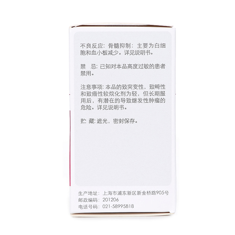 【注意事項】1.本品的致突變性,致畸性和致癌性較烷化劑為輕,但長期服用后,有潛在的導致繼發性腫瘤的危險;2.對生殖功能的影響,雖也較烷化劑類抗癌藥為小,但亦可導致閉經和精子減少或缺乏,尤其是在長期應用較大劑量后,但一般多不嚴重,有時呈不可逆性;3.全身極度衰竭、惡液質或并發感染及心、肺、肝、腎功能不全時,禁用本品。周圍血象如白細胞低于3500/mm3或血小板低于50000/mm3時不宜用;