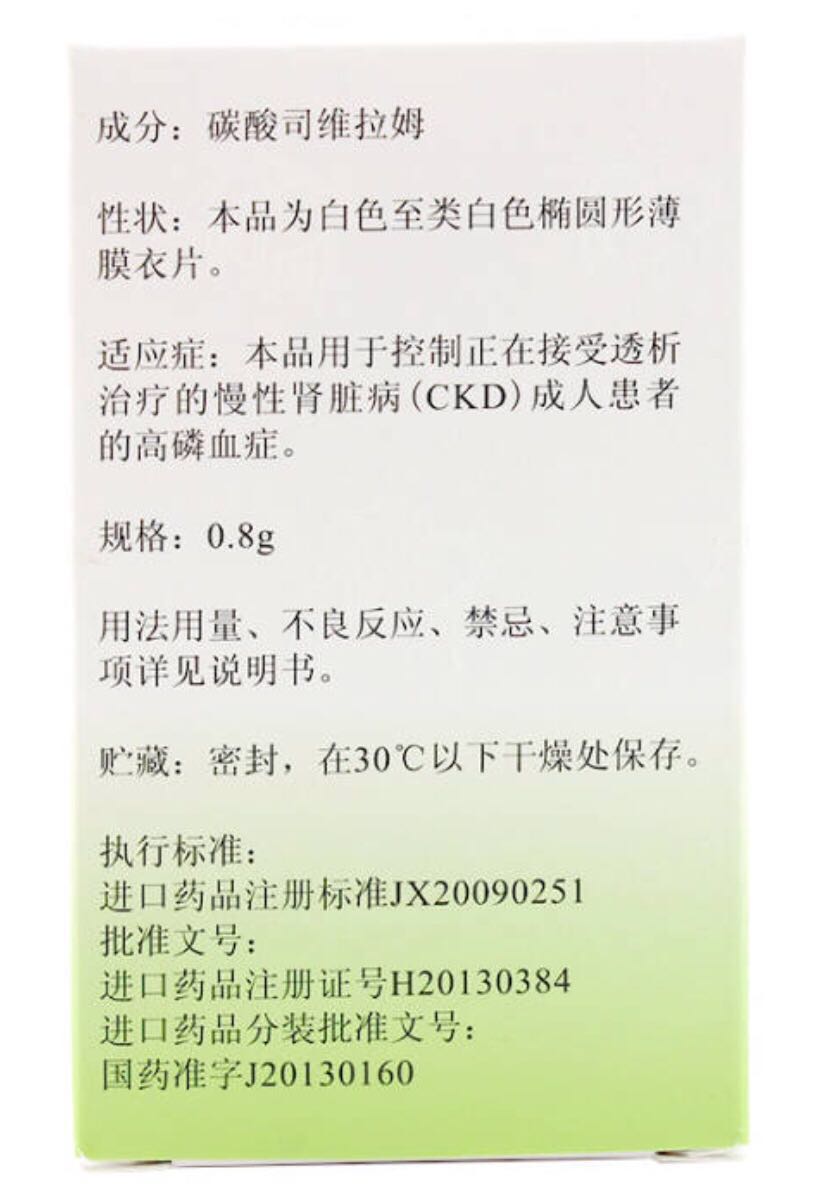 藥理毒理: 碳酸司維拉姆是一種不會被人體吸收的聚合物,不含金屬及鈣。它攜帶多個胺基,由一個碳原子與聚合物骨架連接。這些胺基會在腸道內部分質子化,并以離子交換和氫鍵與磷酸分子結合。碳酸司維拉姆通過結合胃腸道中的磷,降低其吸收,達到降低血磷濃度的效果。 【藥代動力學】本藥難溶于水,目前只有口服懸液劑,空腹或餐后口服,分別在3~4h和4~10h達到血藥峰濃度。血漿蛋白結合率高達98.2%,主要與白蛋白結合。表觀分布容積平均高達1744L,具有高度組織穿透力。可透過胎盤屏障,在乳汁中有分泌。
