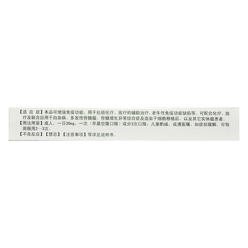 【功能主治/適應癥】可增強免疫功能,用于抗癌化療、放療的輔助治療,老年性免疫功能缺陷等。可配合化療、放療及聯合應用于白血病、多發性骨髓瘤、骨髓增生異常綜合癥及造血干細胞移植后,以及其它實體瘤患者。