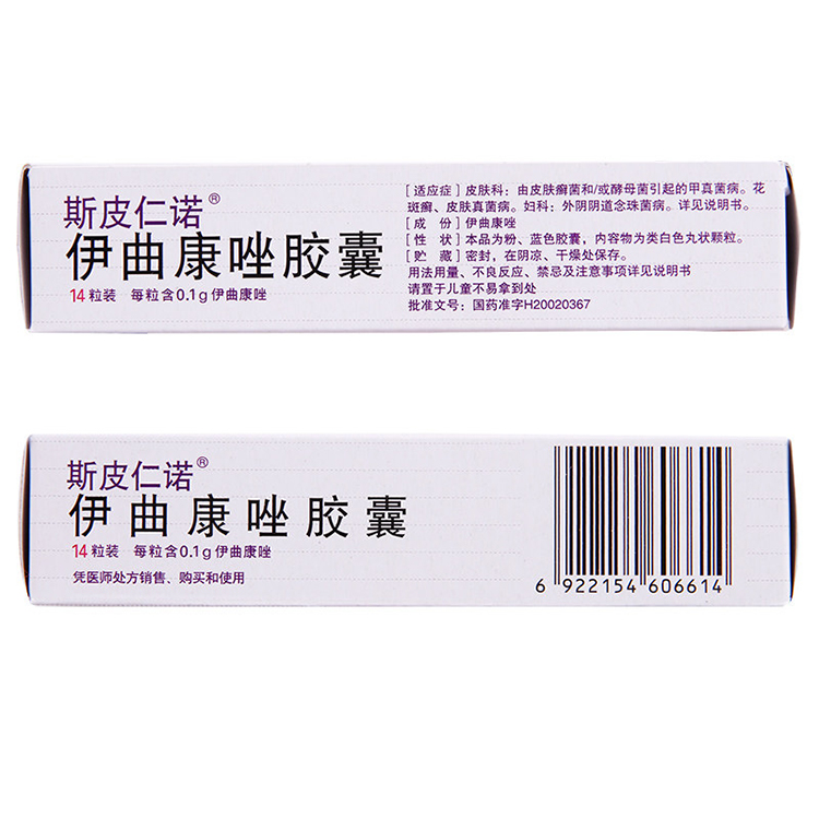 【用法用量】為達到最佳吸收,用餐后立即口服給藥。念珠菌性陰道炎:每次200mg,每日二次,療程為1日或每次200mg,每日一次,療程為3日; 花斑癬:每次200mg,每日一次,療程為7日;皮膚真菌?。好看?00mg,每日一次,療程為15日;高度角化區(如足底部癬、手掌部癬)需:延長治療15日,每次100mg,每日一次,療程為15日。 口腔念珠菌?。好看?00mg,每日一次,療程為15日;真菌性角膜炎:每次200mg,每日一次,療程為21日;對于一些免疫缺陷病人,如白血病、艾滋病或器官移植病人等,采用伊曲康唑膠囊治療真菌感染時,伊曲康唑的口服生物利用度可能會降低,劑量可加倍。甲真菌?。簺_擊治療:每次200mg,每日二次,連用一周為一個沖擊療程。對于指甲感染,推薦采用兩個沖擊療程,每個療程間隔3周:對于趾甲感染,推薦采用三個沖擊療程。每個療程間隔3周?;蛘卟捎眠B續治療:每次200mg,每日一次,連用斯皮仁諾伊曲康唑膠囊三個月。