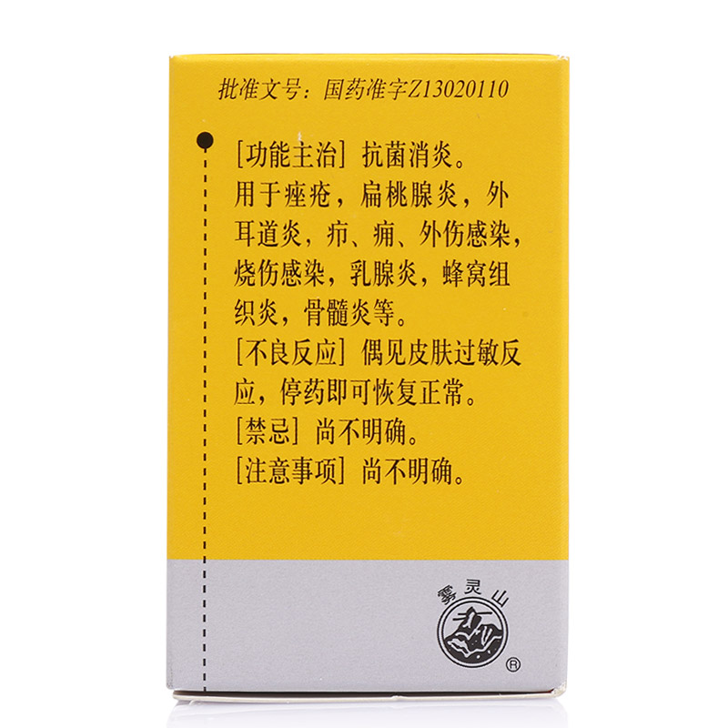 【功能主治】抗菌消炎。用于骨髓炎,痤瘡,扁桃腺炎,外耳道炎、癤、癰、外傷感染,燒傷感染,乳腺炎,蜂窩組織炎等。
