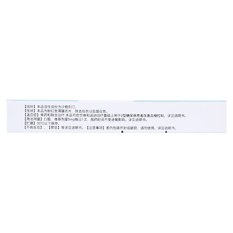 【藥代動力學】吸收:5mg每日1次給藥后,沙格列汀的中位達峰時間(Tmax)為2h,沙格列汀活性代謝物Tmax為4h。與空腹相比,高脂飲食后給藥能使沙格列汀的Tmax延長約20min。沙格列汀餐后給藥比空腹給藥的AUC值提高27%。沙格列汀可與食物同時服用或分開服用。分布:沙格列汀及其活性代謝物在體外人血漿中的蛋白結合率可忽略不計。因此,各種疾病狀態(如腎或肝功能不全)引起的血漿蛋白水平的改變不影響沙格列汀的分布。代謝:沙格列汀的代謝主要由CYP3A4/5介導。沙格列汀的主要代謝產物也是DPP-4抑制劑,其抑制活性作用是沙格列汀的二分之一。因此,CYP3A4/5強抑制劑和強誘導劑能改變沙格列汀及其代謝物的藥代動力學。排泄:沙格列汀通過腎和肝排泄。單次給予5mg14C-沙格列汀后,尿中排泄出的沙格列汀、沙格列汀活性代謝物、總放射性物分別為給藥劑量的24%、36%和75%。沙格列汀的平均腎清除率(~230mL/min)大于平均腎小球濾過率(~120mL/min),提示存在主動的腎臟清除。總共有22%的放射性物質在糞便中回收,提示部分沙格列汀通過膽汁排泄和/或部分未吸收的藥物經胃腸道排泄。健康志愿者單次口服沙格列汀5mg后,沙格列汀及其活性代謝物的平均血漿半衰期(t1/2)分別為2.5h和3.1h。