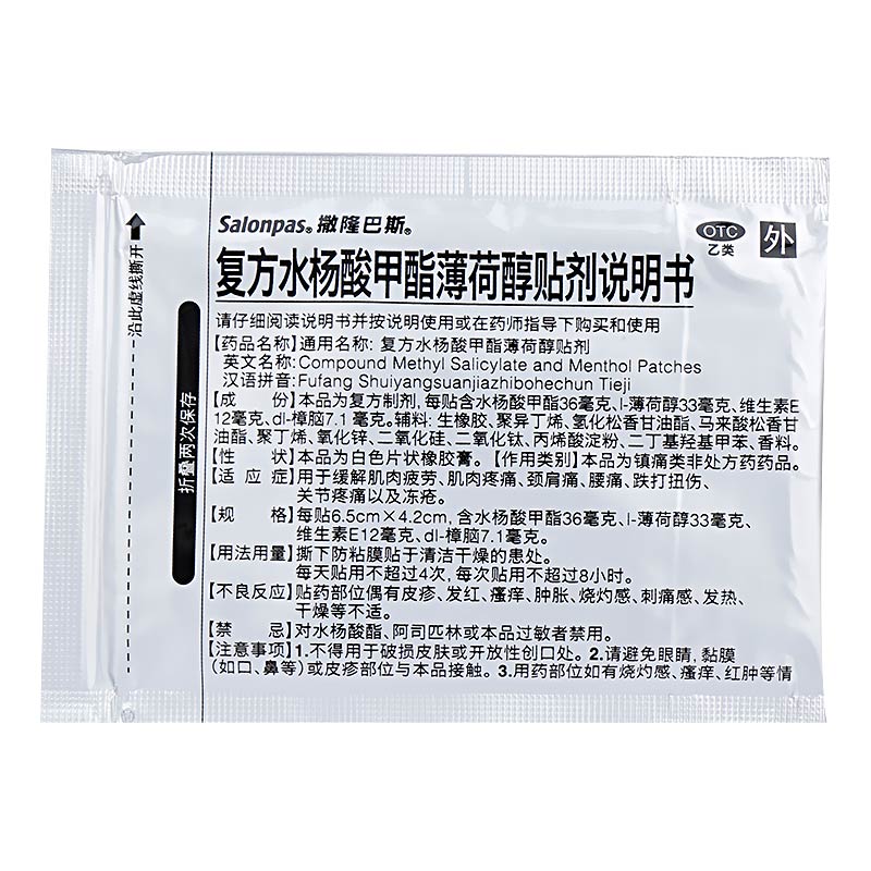 【成 份】 本品為復方制劑,每貼含水楊酸甲酯36毫克、l-薄荷醇33毫克、維生素E12毫克、dl-樟腦7.1毫克。