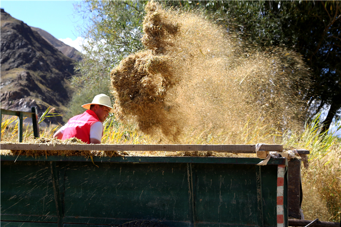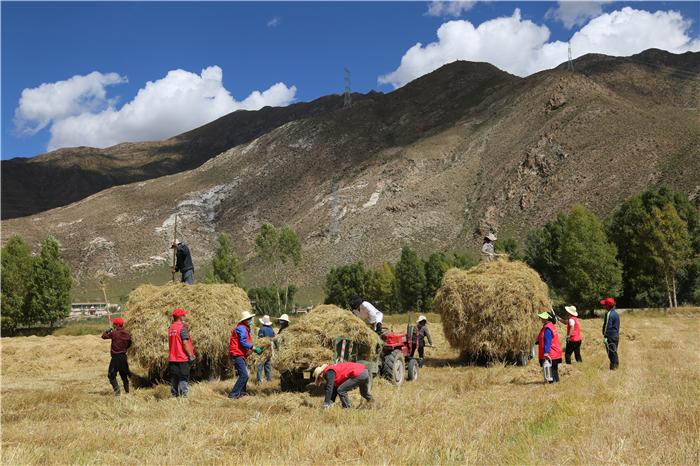 秋高氣爽,艷陽高照,正是拉薩農民青稞豐收的好日子,大家臉上都洋溢著收獲的喜悅。但普窮卻怎么也開心不起來,幾天前妻子因病去世,按照當地風俗,普窮需要在家守靈,不方便外出勞作。現在村里的青稞差不多都進了谷倉,只有自己家的青稞地還一片金黃,普窮看在眼里急在心里。西藏阜康藥店聯合黨支部得知普窮家的情況后,迅速做出反應,組織了阜康藥店及阜康醫院25名志愿者前往卡優村幫助他搶收青稞。