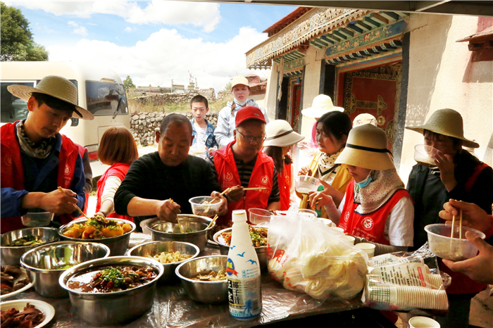 中午一點,大家饑腸轆轆。回到休息地,一盆盆香噴噴的飯菜已然上桌,土豆燒排骨、魔芋燉鴨子、紅燒雞肉、熗炒小白菜、爽口綠豆湯,香氣撲鼻,十分豐盛。辛勤勞作后的飯菜最是可口,大快朵頤后,稍作休息,大家便再次投入到青稞的搶收工作。驕陽似火,收割忙碌,一顆顆豆大的汗珠順著臉龐劃落。下午6點左右, 20多畝地的青稞全部收割、裝運完畢,搶收工作圓滿完成。