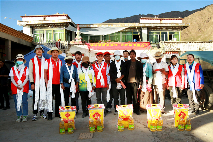 隨后,西藏阜康藥店聯合黨支部還向當地困難群眾發放了油、米和慰問金,以表達阜康黨委對他們節日的問候。村民們為志愿者們獻上了哈達,并希望來年秋收還能得到他們的幫助。